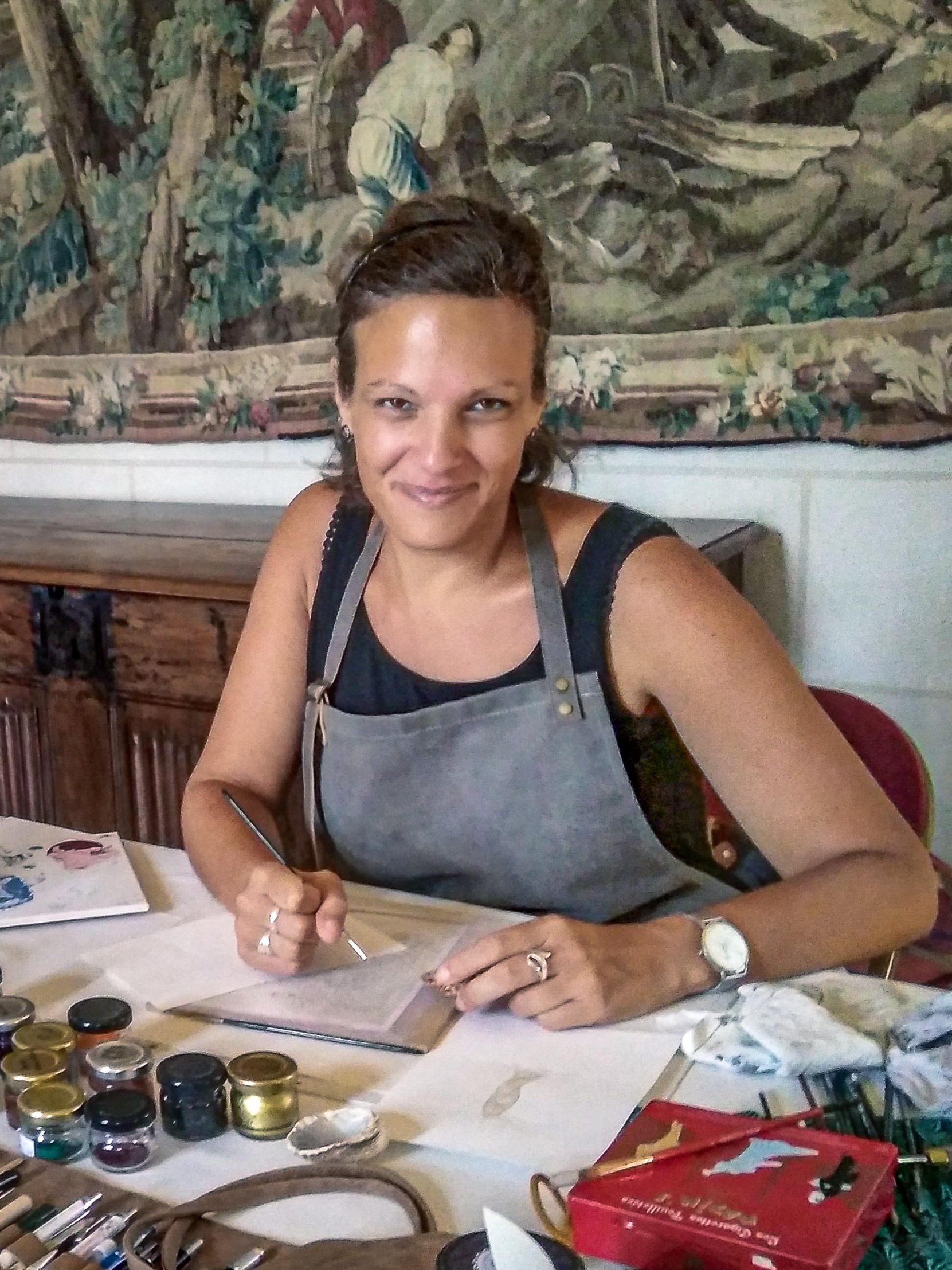 « L’enluminure, pour moi, c’est la possibilité de peindre des couleurs vives, de calligraphier, de dorer, de parer d’ornements les écrits en donnant vie aux mots, de créer, de découvrir tous les jours un peu plus la richesse immense de ce patrimoine artistique médiéval… ! Pigments, métaux précieux et parchemin deviennent alors les outils du quotidien au service d’un art qui a encore sans l’ombre d’un doute toute sa place aujourd’hui ! »